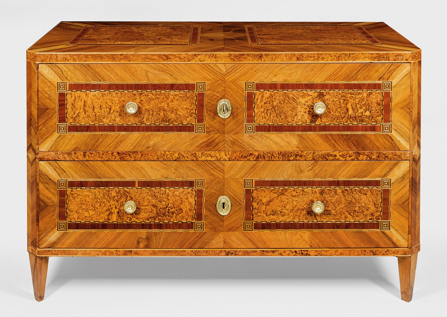 Nussbaum und Wurzelholz, furniert sowie Einlagen aus Pflaumenholz und Ahorn. Gerader, querrechteckig angelegter Korpus, flankiert von schmalen, schräggestellten Ecklisenen auf konischen Vierkantbeinen. In der gegliederten Front zwei breite Schubladen. Dem Korpus entsprechende Deckplatte. Flächendeckend breit gerahmte Furnierfelder, von Bandeinlagen mit ornamentierten Reserven in den Ecken begrenzt. H. 85 cm. 129 cm x 65 cm.