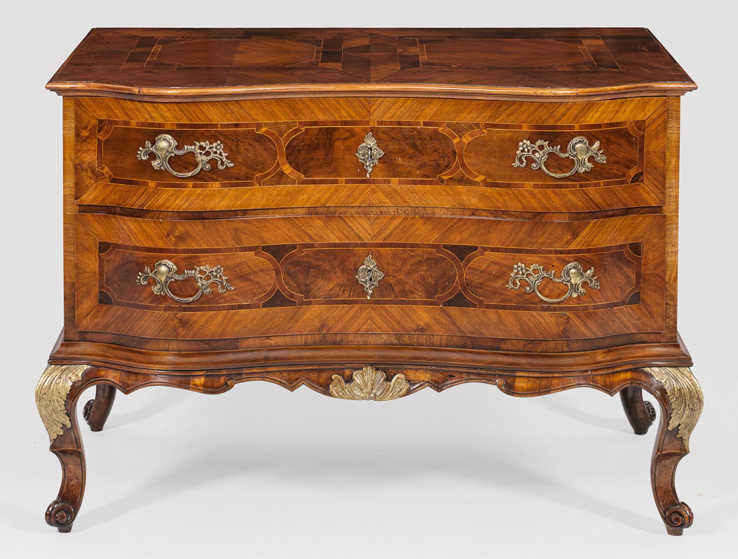 Nussbaum, furniert und teilw. reliefplastisch geschnitzt sowie Einlagen aus Pflaumenholz. Gerader, querrechteckig angelegter Korpus auf passig geschweifter Zarge und blattreliefierten Volutenbeinen. In der gegliederten Front zwei breite, doppelt geschweifte Schubladen. Gering überstehende Deckplatte. Flächendeckend breit gerahmte Furnierfelder, von Bandeinlagen begrenzt. H. 86 cm. 120 cm x 66 cm.