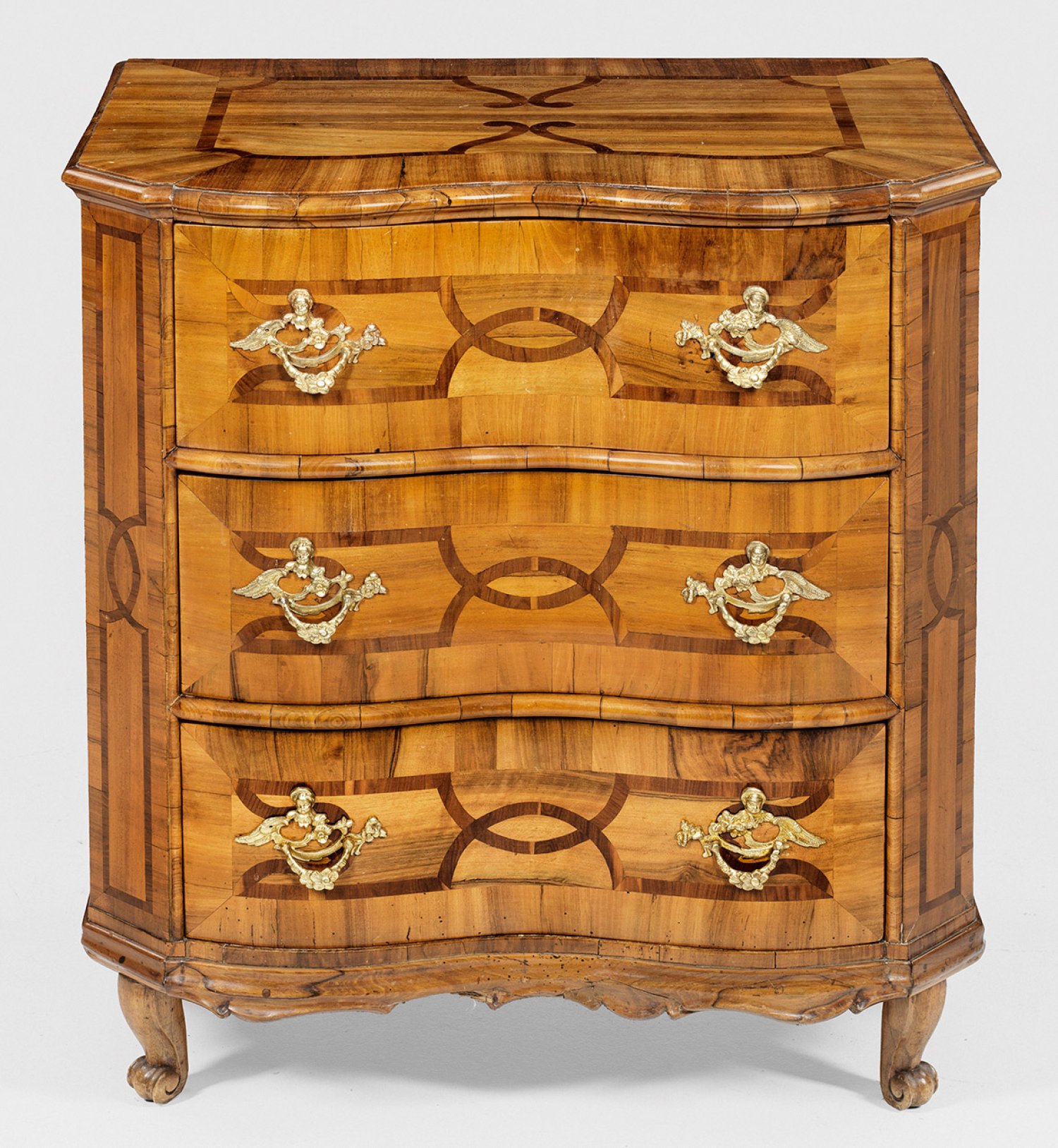 Nussbaum, furniert sowie Einlagen aus Pflaumenholz. Gerader, rechteckiger Korpus, flankiert von breiten, schräggestellten Ecklisenen auf passig geschweifter Zarge und Volutenfüßen. In der gegliederten Front drei Schubladen. Korrespondierende, gering überstehende Deckplatte. Flächendeckend breit gerahmte Furnierfelder, von verschlungenen Bandeinlagen begrenzt. Vergoldete Griffe mit reliefierten Puttenköpfen. H. 80 cm. 72 cm x 50 cm.