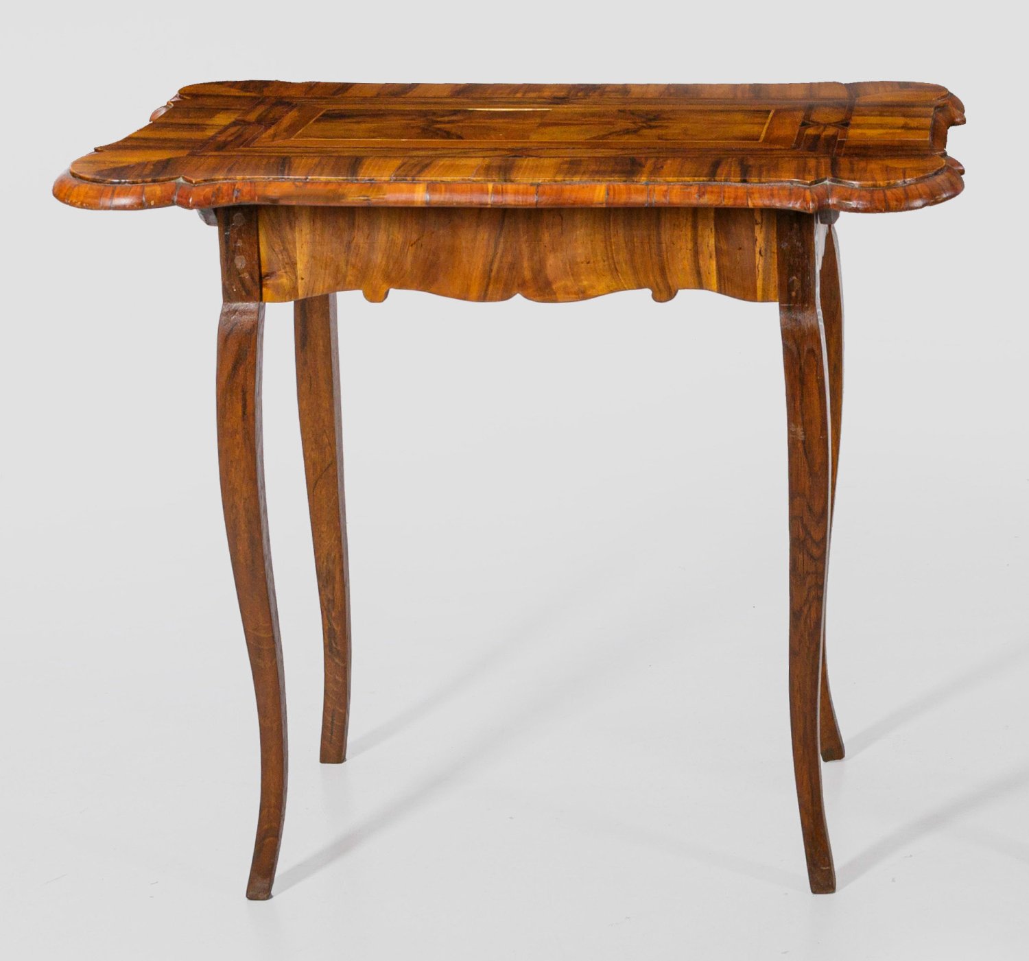 Nussbaum, furniert und Eichenholz. Passig geschweifte Zarge auf hohen, geschwungenen Beinen. Weit überstehende, profilierte Deckplatte mit verkröpften Ecken sowie flächendeckenden Furnierfeldern, von Bandeinlagen begrenzt. H. 78 cm. 91 cm x 60 cm.