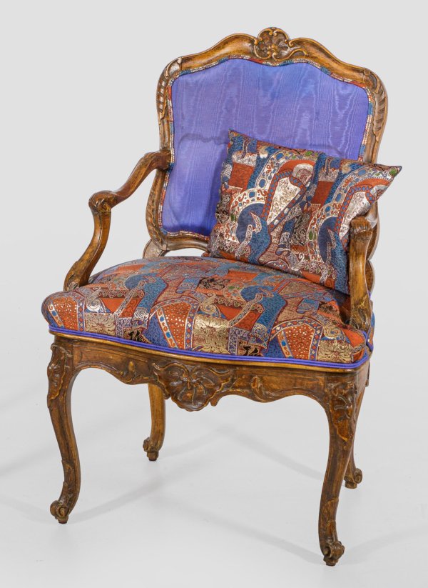 Buchenholz, reliefplastisch geschnitzt. Trapezförmige, passig geschweifte Zarge auf geschwungenen Volutenbeinen mit Muschelwerk. Korrespondierende Stützen für schmale Armlehnen sowie schildförmige, umlaufend profilierte Rückenlehnenrahmung mit Muschelbekrönung. Gepolstert und bezogen. H. 95,5 cm. 65 cm x 50 cm. Sitz-H. 48 cm.