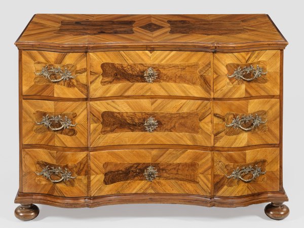 Nussbaum, furniert. Gerader, querrechteckig angelegter Korpus auf schmaler Profilzarge und gedrückten Füßen. In der gegliederten Front drei breite, gegenläufig geschweifte Schubladen. Gering überstehende, profilierte Deckplatte. Flächendeckend breit gerahmte, kartuschenförmige Furnierfelder, von Fadeneinlagen begrenzt. H. 81 cm. 120 cm x 66,6 cm.
