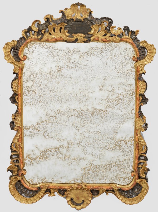 Holz, geschnitzt, teilw. in Marmoroptik gefasst und teilw. vergoldet. Hochrechteckig angelegte Spiegelrahmung aus schmalen profilierten Voluten. Umgeben von üppigem, durchbrochen gearbeitetem Muschelwerk. Korrespondierende Bekrönung aus zentraler Kartusche und Rocaillen sowie entsprechender unterer Abschluss. Facettiertes Spiegelglas mit Altersspuren. Rest. mit Erg.; 123 cm x 90 cm.