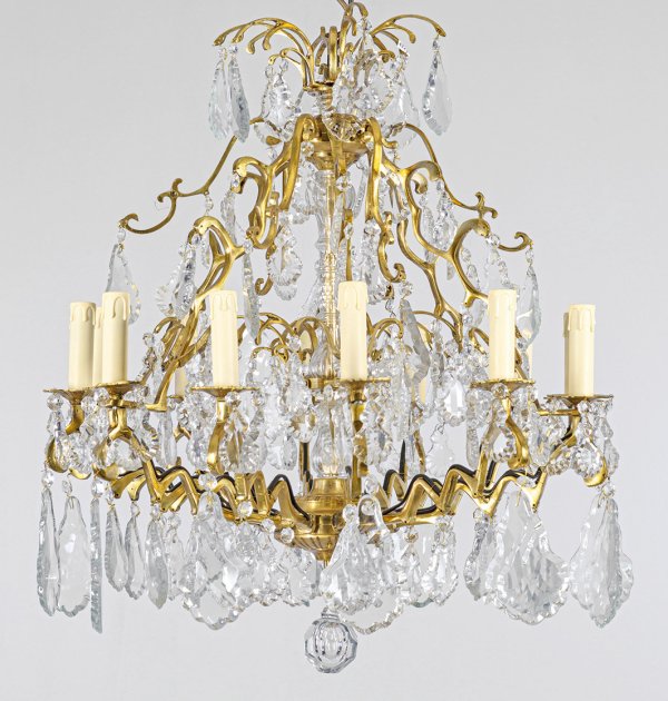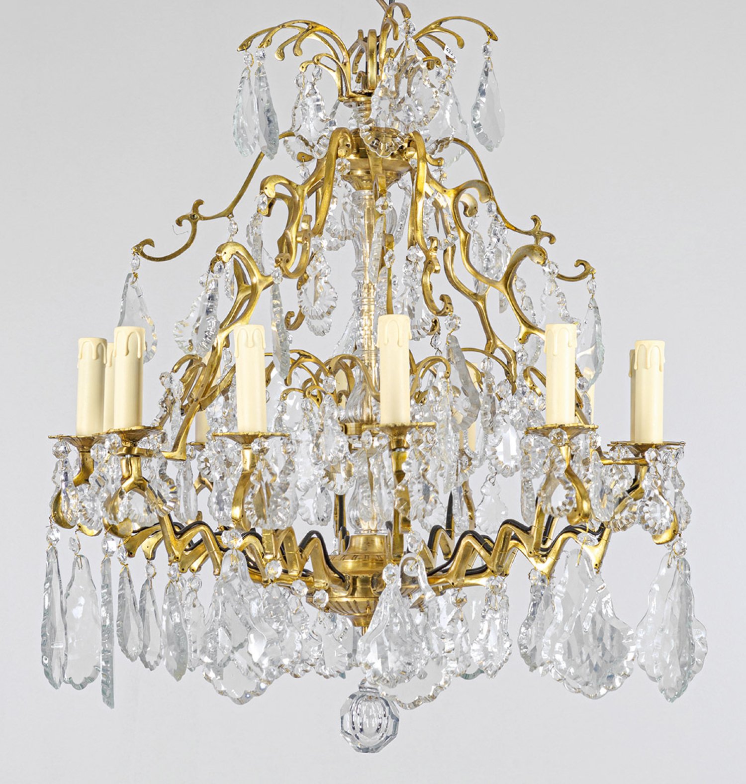 12-flg.; Bronze und farbloses Glas. Balusterförmiger Korpus aus stark geschwungenen, gegeneinander gestellten Streben als Träger für Leuchtmittel mit zylinderförmigen Tüllen. Reicher Behang aus facettierten Prismen. Elektrifiziert. H. 70 cm. D. 64 cm.