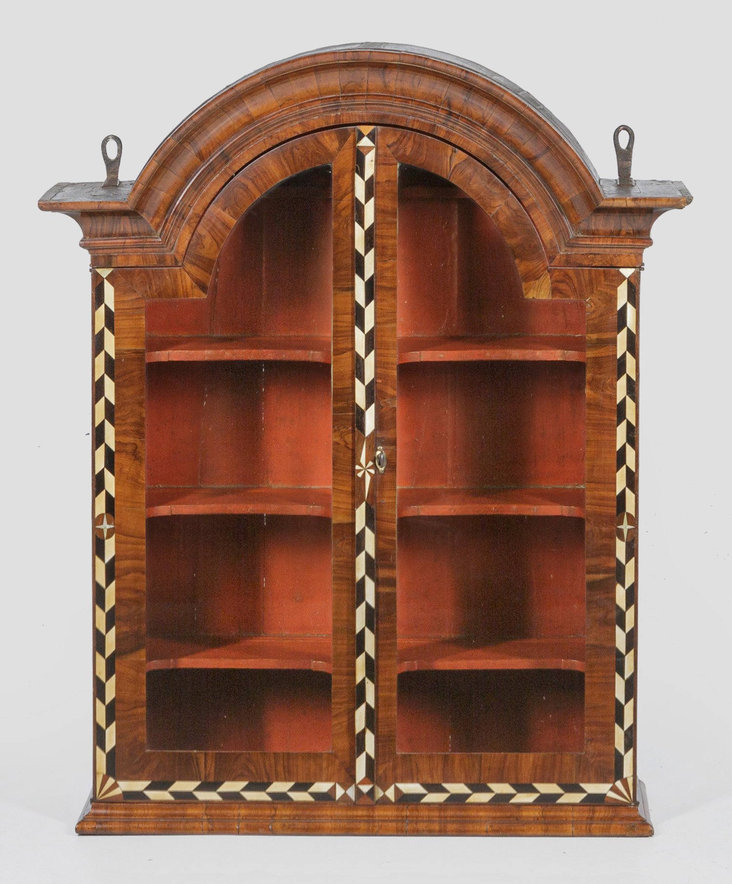 Nussbaum, furniert. Gerader, hochrechteckiger Korpus auf schmaler Zarge. In der gegliederten Front zwei Vitrinentüren. Profiliertes, mittig segmentartig aufgeworfenes Kranzgesims. Breit gerahmte Furnierfelder mit kontrastierenden Einlagen aus Knochen. H. 97,5 cm. 79 cm x 23,5 cm.