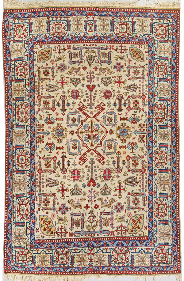 Persien. 1930er Jahre. Wolle auf Baumwolle. Im elfenbeinfarbenem Innenfeld flächendeckende Musterung aus unterschiedlichen Kartuschen, sog. gebrochenen Stäben und stilisierten Tieren. Umlaufend breite, durch Zackenblätter in Felder unterteilte Bordüre, flankiert von blauen Bändern mit Rankenwerk. 210 cm x 138 cm.