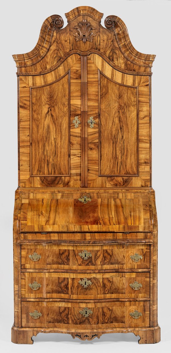 Nussbaum, auf Eichenholz furniert. Gerader Korpus flankiert von gerundeten Lisenen auf schmal gewulsteter Zarge und gesägten Füßen. In der gegliederten Front drei mehrfach gegenläufig geschweifte Schubladen sowie ausziehbare Stützen für bombierte, schräggestellte und abklappbare Arbeitsfläche. Dahinter gestaffelte Facheinteilung. Oberhalb korrespondierender zweitüriger Aufsatz mit hochaufgeworfenem, gesprengtem Giebel aus eingerollten Voluten. Innen Ablage- und Schubfächer. H. 244 cm. 104 cm x 50 cm.