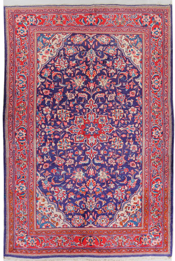 Persien. 1960er Jahre. Wolle auf Baumwolle. Im blauen Innenfeld rotes Zentralmedaillon sowie passig geschweifte Ecklösungen. Flächendeckende Musterung aus üppigen Blütenranken. Umlaufend breite, rotgrundige Palmettenbordüre, flankiert von schmalen Bändern. 209 cm x 316 cm.