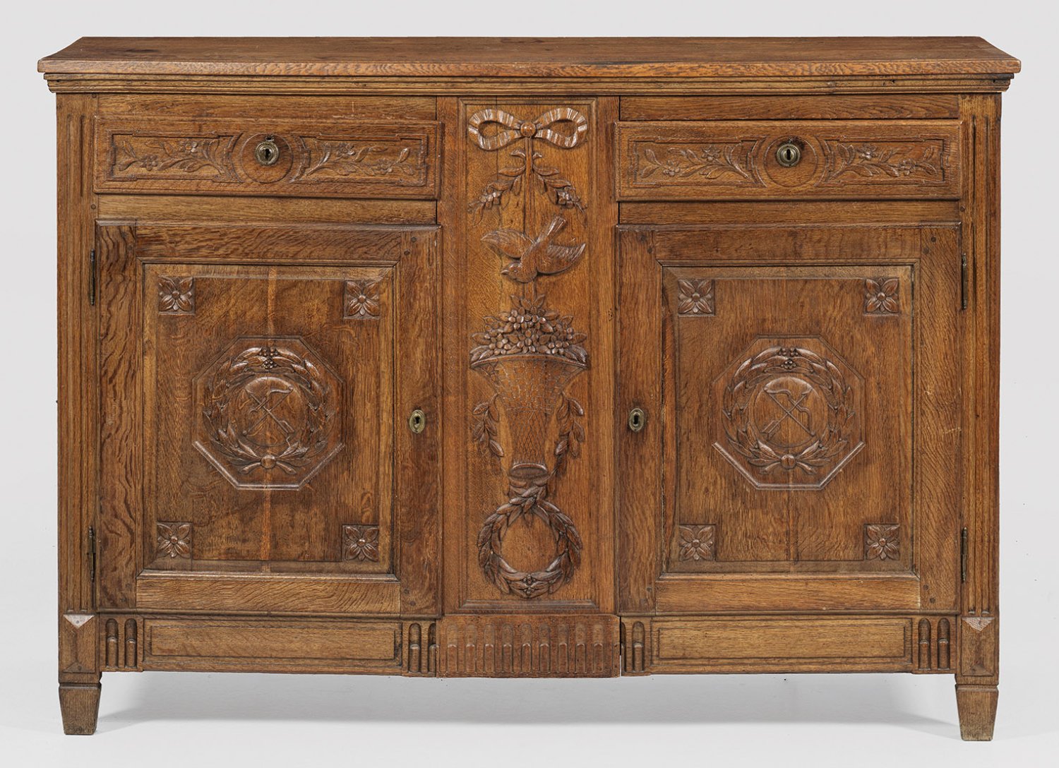 Eichenholz, teilw. reliefplastisch geschnitzt. Gerader, querrechteckig angelegter Korpus, flankiert von kannelierten Lisenen, in gekantete Füße übergehend. In der gegliederten Front zwei kassettierte Türen mit erhaben reliefierten Bogenmotiven sowie oberhalb zwei Schubfächer. Dazwischen breiter Steg mit erhaben reliefiertem, schleifenbekröntem Fruchtkorb und Taubenmotiv. Gering überstehende, profilierte Deckplatte. H. 110 cm. 160 cm x 46 cm.