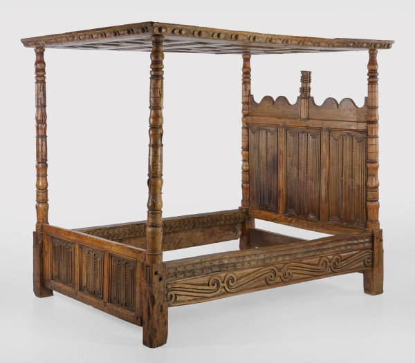 Eichen-, Kiefernholz und Nussbaum. Mehrfach gegliederte Pfosten als Träger für kassettierte Decke. Hohes Betthaupt mit geschweiftem oberen Abschluss und Füllungen aus Faltwerk sowie korrespondierendes Bettende. Breite Seitenwangen mit Volutenmotiven. H. 198 cm. 166 cm x 235.