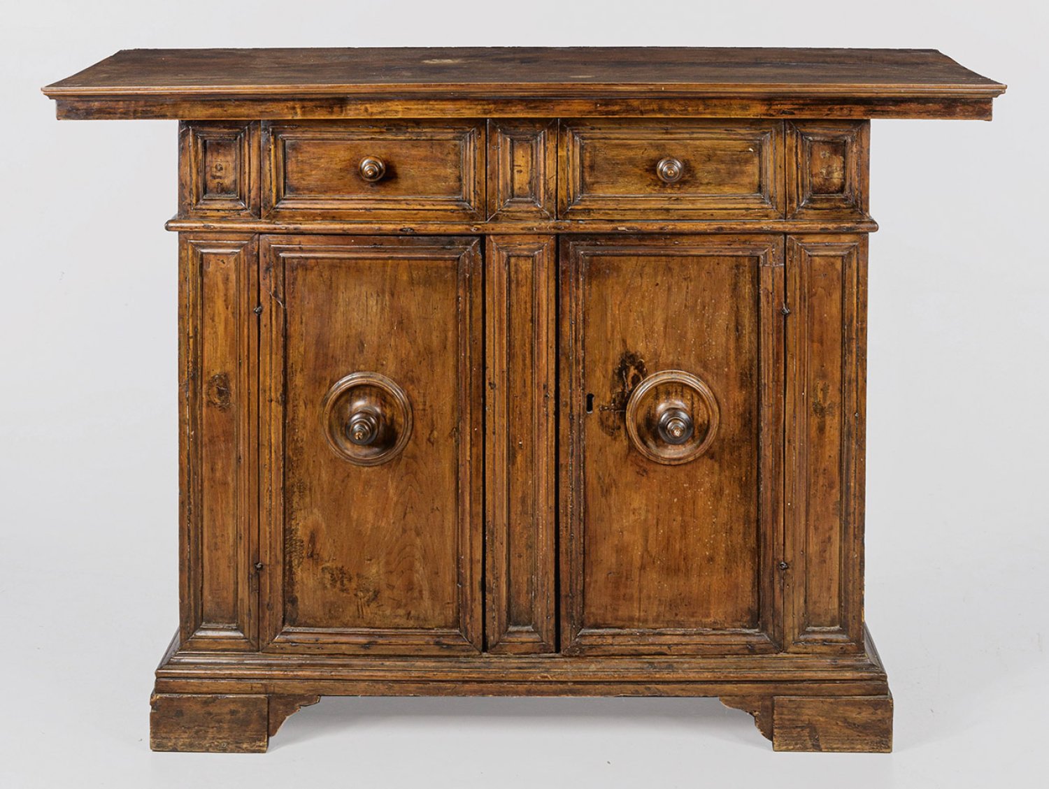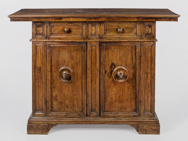 Nussbaum. Gerader, querrechteckig angelegter Korpus auf schmaler Profilzarge und gesägten Füßen. In der gegliederten Front aus profilierten Feldern zwei Türen mit zentralen Balusterknäufen sowie oberhalb korrespondierende Schubfächer. Weit überstehende, rechteckige Deckplatte. H. 104 cm. 145 cm x 51 cm.