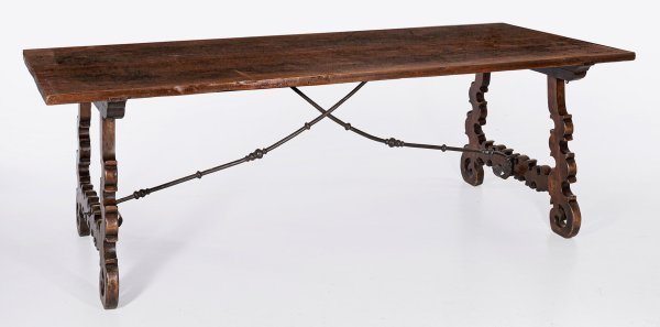 A Spanish walnut and iron refectory table.