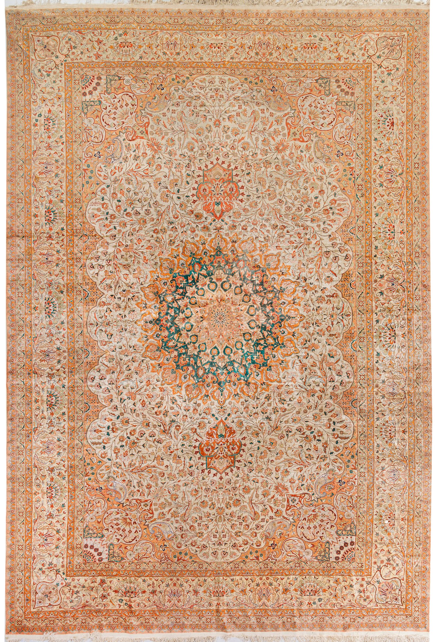 Türkei. Seide auf Seide teilw. metallbroschiert. Sehr feine Knüpfung. Im elfenbeinfarbenen Innenfeld großes zentrales Rundmedaillon mit Palmettenanhängern sowie breite passig geschweifte Ecklösungen in Apricot. Flächendeckende Musterung aus dicht angeordneten Blütenranken. Umlaufend breite Bordüre mit Dolden, flankiert von schmalen Bändern in entsprechender Farbigkeit. 317 cm x 462 cm.