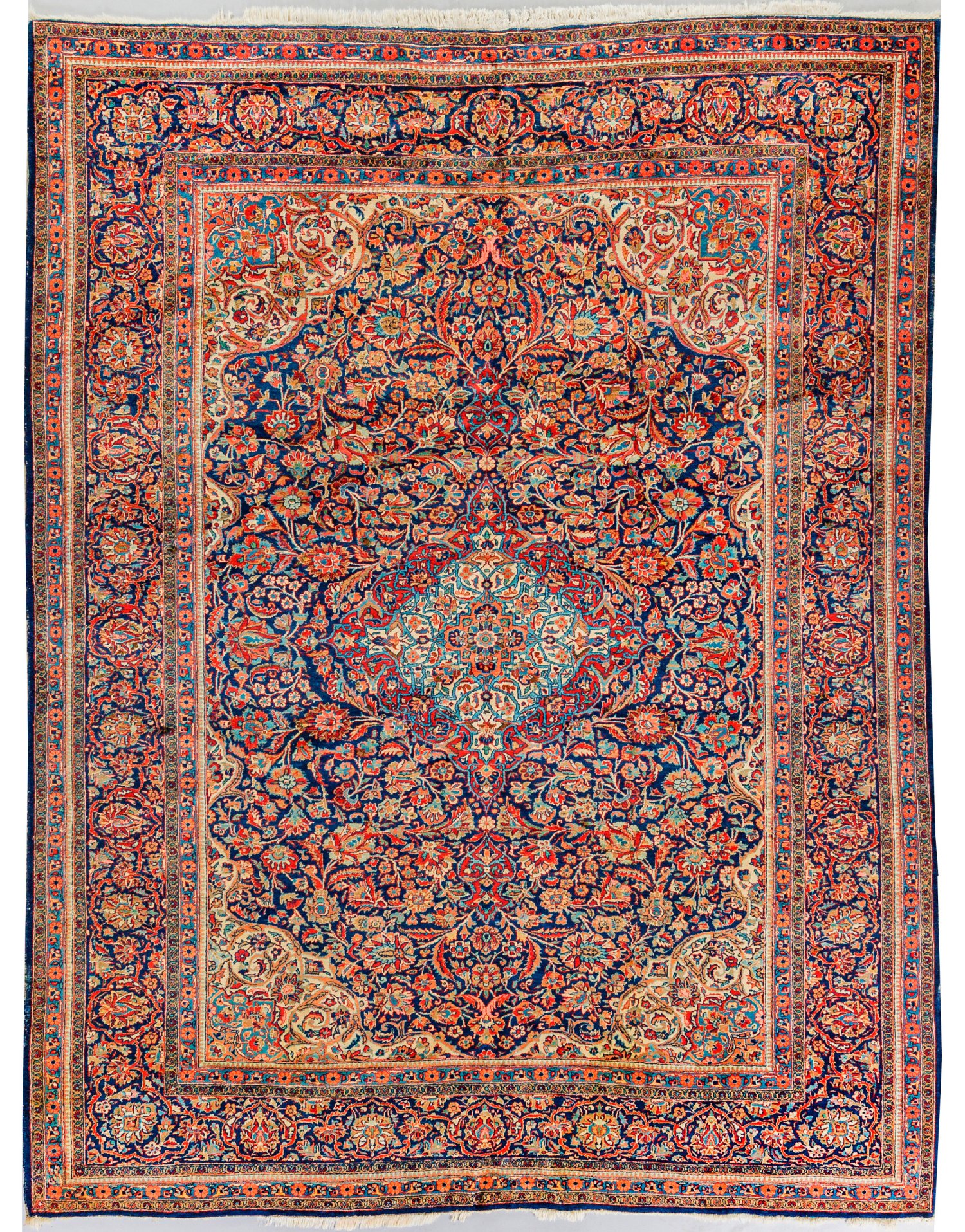 Persien. 1960er Jahre. Wolle auf Baumwolle. Im dunkelblauen Innenfeld zentrales, quer gestrecktes Medaillon sowie passig geschweifte, cremefarbene Ecklösungen. Flächendeckend dichte Musterung aus üppigen Blütenranken. Umlaufend breite Palmettenbordüre in korrespondierender Farbigkeit, flankiert von schmalen Nebenbordüren. 228 cm x 300 cm.