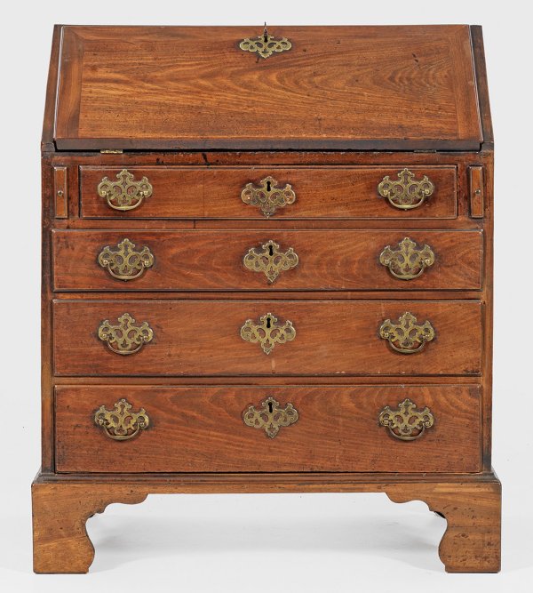 Mahagoni, furniert. Gerader, rechteckig angelegter Korpus auf schmaler Zarge und gesägten Füßen. In der gegliederten Front vier Schubladen unterschiedlicher Größe sowie ausziehbare Stützen für schräggestellte, abklappbare Arbeitsplatte. Dahinter gestaffelte Facheinteilung. H. 92 cm. 80 cm x 42 cm.
