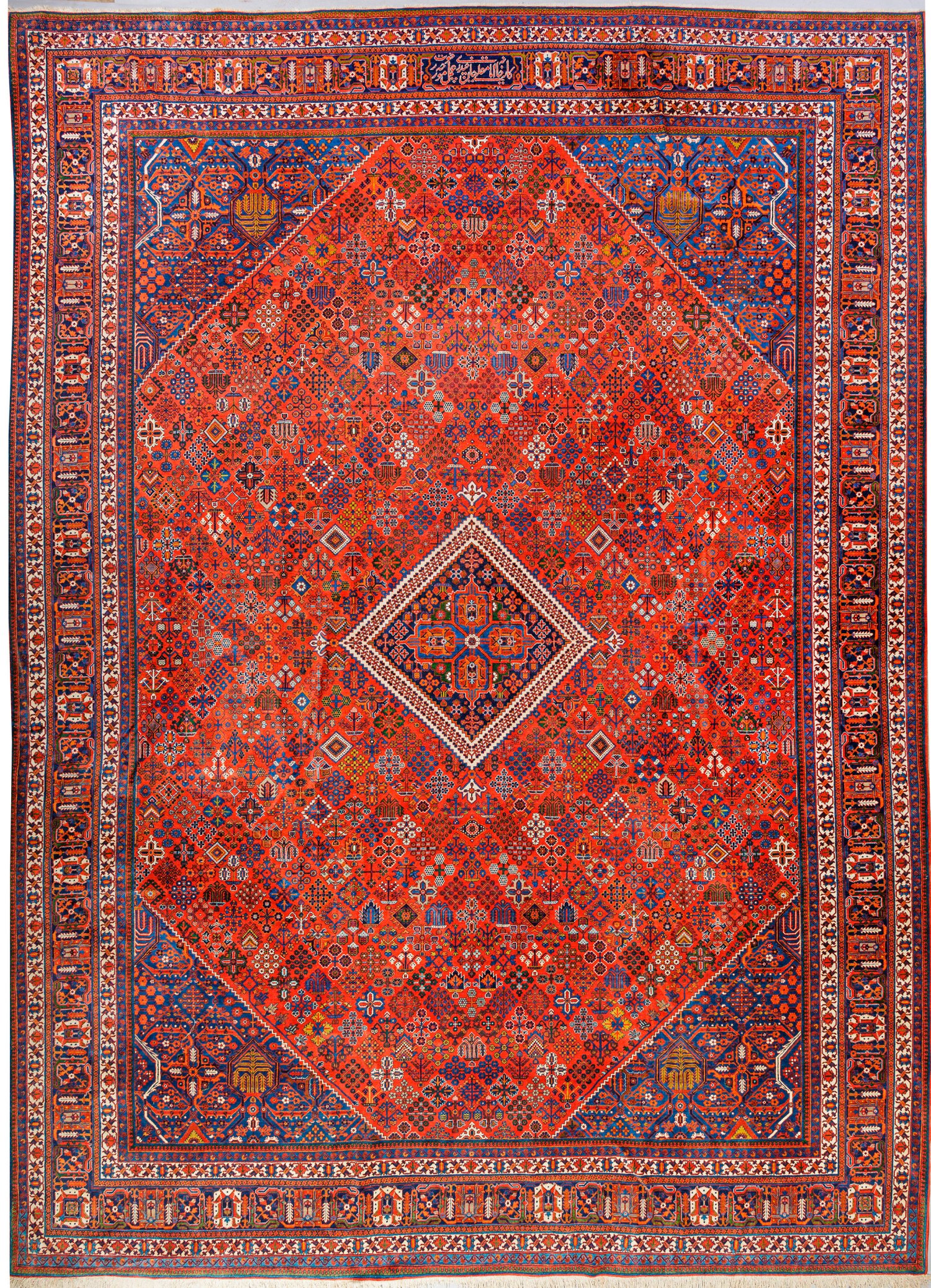 Persien. Um 1960; Wolle auf Baumwolle. Im roten Innenfeld zentrales Rautenmotiv sowie gerade, blaugrundige Ecklösungen. Flächendeckende Musterung aus rautenartig angeordneten Blüten im Rapport. Umlaufend breite, mehrteilige Bordüre. Sign.; 368 cm x 520 cm.