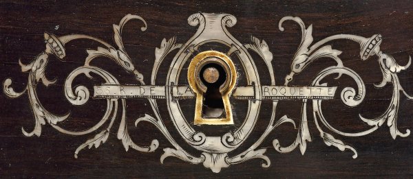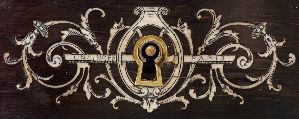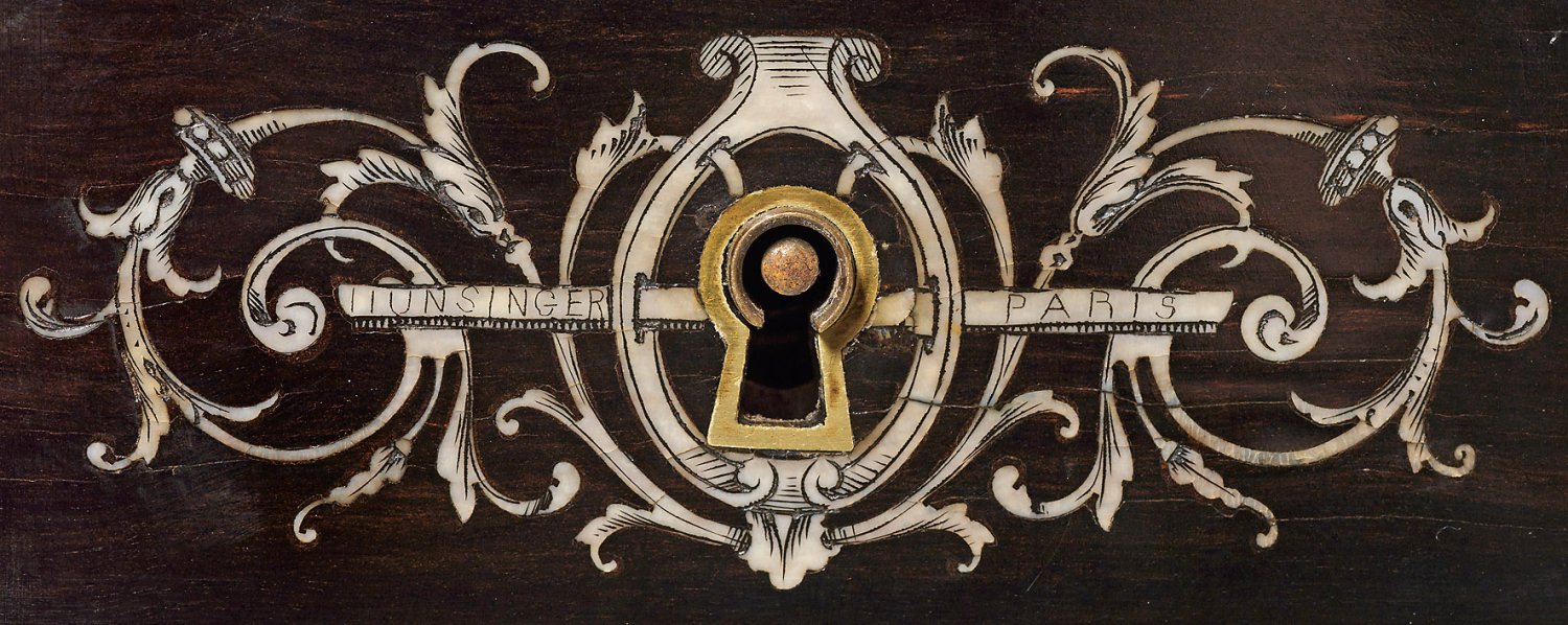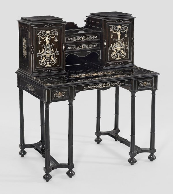 Holz, ebonisiert und teilw. schwarz lackiert sowie reiche Einlagen aus fein graviertem Elfenbein. Dreischübiger Zargenkasten auf schlanken, kannelierten Säulenschäften, unterhalb durch schmale Stege verbunden. Gering überstehende, profilgerahmte Deckplatte. Zurückgesetzter zweitüriger Aufsatz, verbunden durch schmale Schübe. Schauseitig reicher Intarsiendekor aus allegorischen Darstellungen unter Draperiewerk sowie üppige Blattranken mit Genien und Hirschen. Auf zwei Schubladen Ritz-Sign. Hunsinger, Paris bzw. Rue de la Roquette. H. 119 cm. 98 cm x 62 cm.