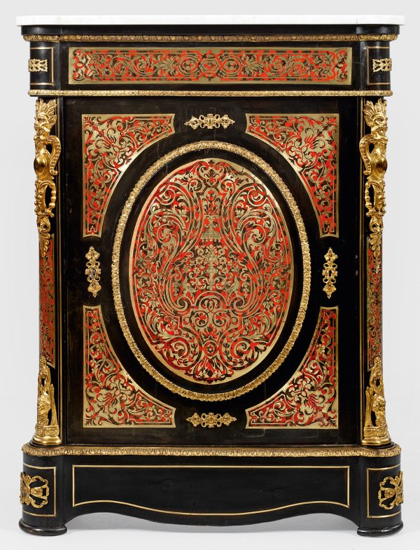 Holz, ebonisiert sowie reiche Marketerie aus Messing und rot hinterlegtem Lack in sog. Boulle-Technik. Gerader Korpus, flankiert von gerundeten Ecklisenen auf geschweiftem Zargensockel. In der gegliederten Front eine Tür mit leicht vorgewölbtem Medaillon sowie reiche Marketerie aus üppigem Volutenwerk. Korrespondierende Deckplatte aus weißem Marmor. H. 111 cm. 84 cm x 39,5 cm.