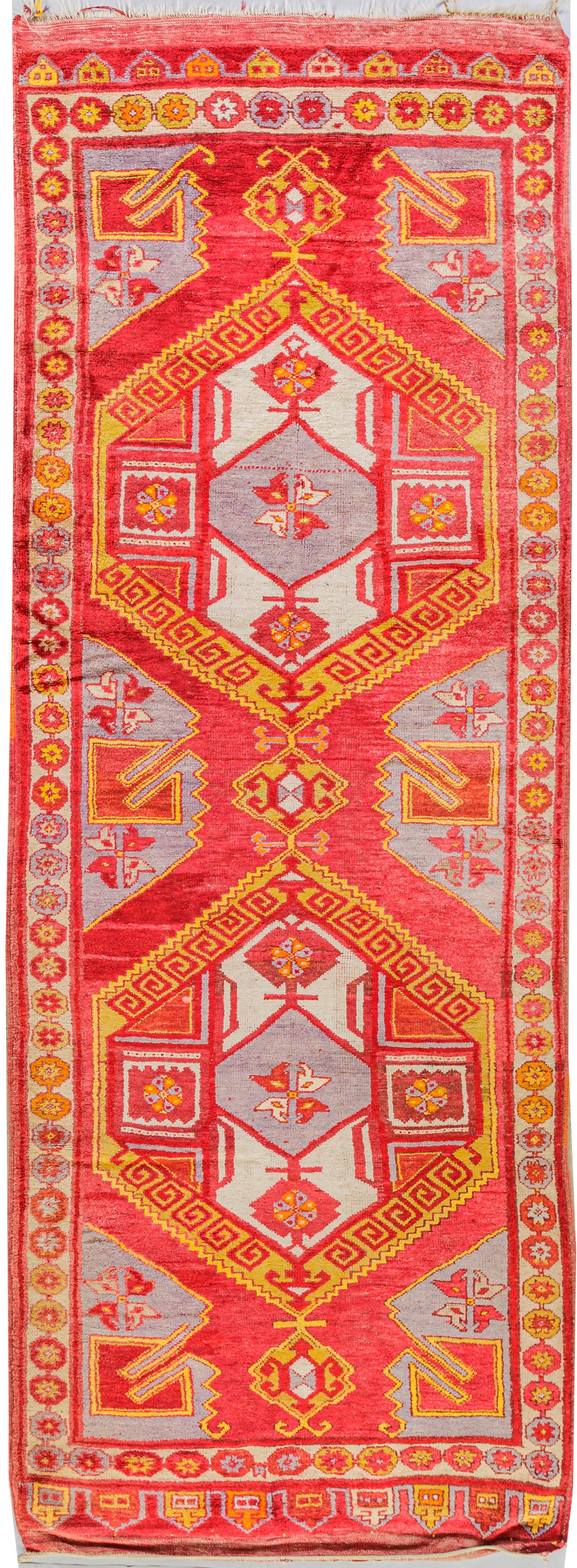 Türkei. Anatolien. 1960er Jahre. Wolle auf Wolle. Im roten Innenfeld zwei große Rautenmotive in gelb und hellgrau mit mäanderförmig eingerollten Hakenmotiven. Umlaufend schmale Rosettenbordüre. 131 cm x 346 cm.