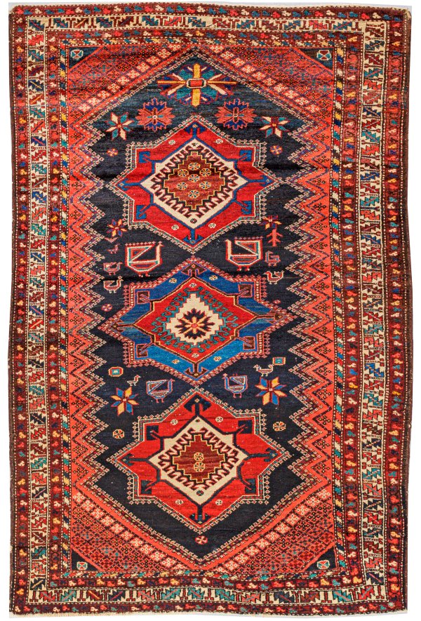 Nordpersien. Mitte 20. Jh.; Wolle auf Baumwolle. Im dunklen Innenfeld drei große Rautenmotive in Rot- und Blautönen. Umlaufend breite, vielteilige Bordüre aus Zackenblättern und Blütenbändern. 215 cm x 138 cm.