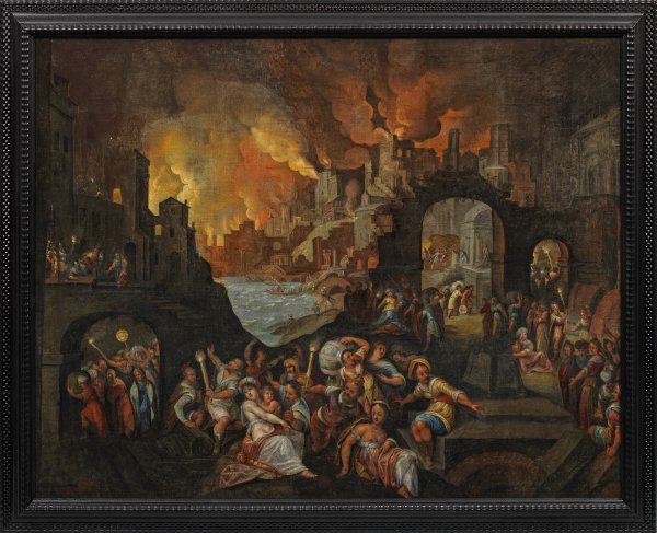Großformatige, höchst dramatische und effektvolle Schilderung des Untergangs von Troja mit der brennenden, nächtlichen Stadt, aus der sich die Menschen zu retten versuchen. Das vorliegende Gemälde lässt sich in Motiv und seinem spätmanieristischen Stil dem Umkreis der beiden flämischen Malerbrüder Frederik und Gillis van Valckenborch zuschreiben, die beide den größten Teil ihres Lebens in Deutschland verbrachten. Sie stammten aus einer Malerfamilie und lernten bei Ihrem Vater Marten van Valckenborch (1534 - 1612) bzw. Gillis auch bei seinem älteren Bruder Frederik; alle drei gingen 1586 in das religiös liberalere Frankfurt am Main. Dort etablierte sich die Malerfamilie rasch als führende Kraft in der Kunst und übte einen wichtigen Einfluss auf die künstlerische Entwicklung aus. Frederik und Gillis van Valckenborch malten in der Tradition von Jan Brueghel dem Älteren mit Vorliebe figurenreich verdichtete, biblische und mythologische Szenen sowie in Landschaften gesetzte Protagonisten der griechischen und römischen Geschichte, darunter Darstellungen des Brandes von Troja sowie von Aeneas bei der Rettung seines Vaters Anchises aus Troja. Während Frederik van Valckenborch 1601 nach Nürnberg zog, blieb Gillis zeitlebens in Frankfurt. In den Motiven und im Stil verwandt sind die Werke des Frankenthaler Malers Peter (Pieter) Schoubroeck (1570 - 1607), der ebenfalls von Jan Brueghel und wohl auch von der Malerfamilie Valckenborch beeinflusst wurde. Öl/Lwd., doubl.; 108 x 139 cm.
