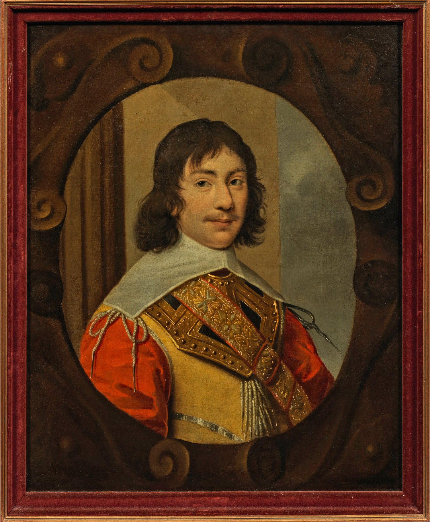Repräsentatives, subtil charakterisierendes, in fein lasierender Malweise ausgeführtes Bildnis eines jungen adeligen Offiziers in breitem, weißem Kragen über prunkvollem Harnischkragen mit feiner Brokatscherpe, dargestellt vor einem Architekturelement und oval umrahmt von staffierten Volutenschwüngen. Charakteristisches, niederländisches Barockbildnis aus dem Umkreis des bekannten Porträtisten Bartholomeus van der Helst. Öl/Lwd., doubliert. Verso diverse alte Papieretiketten. 75,5 cm x 65,5 cm. Rahmen.