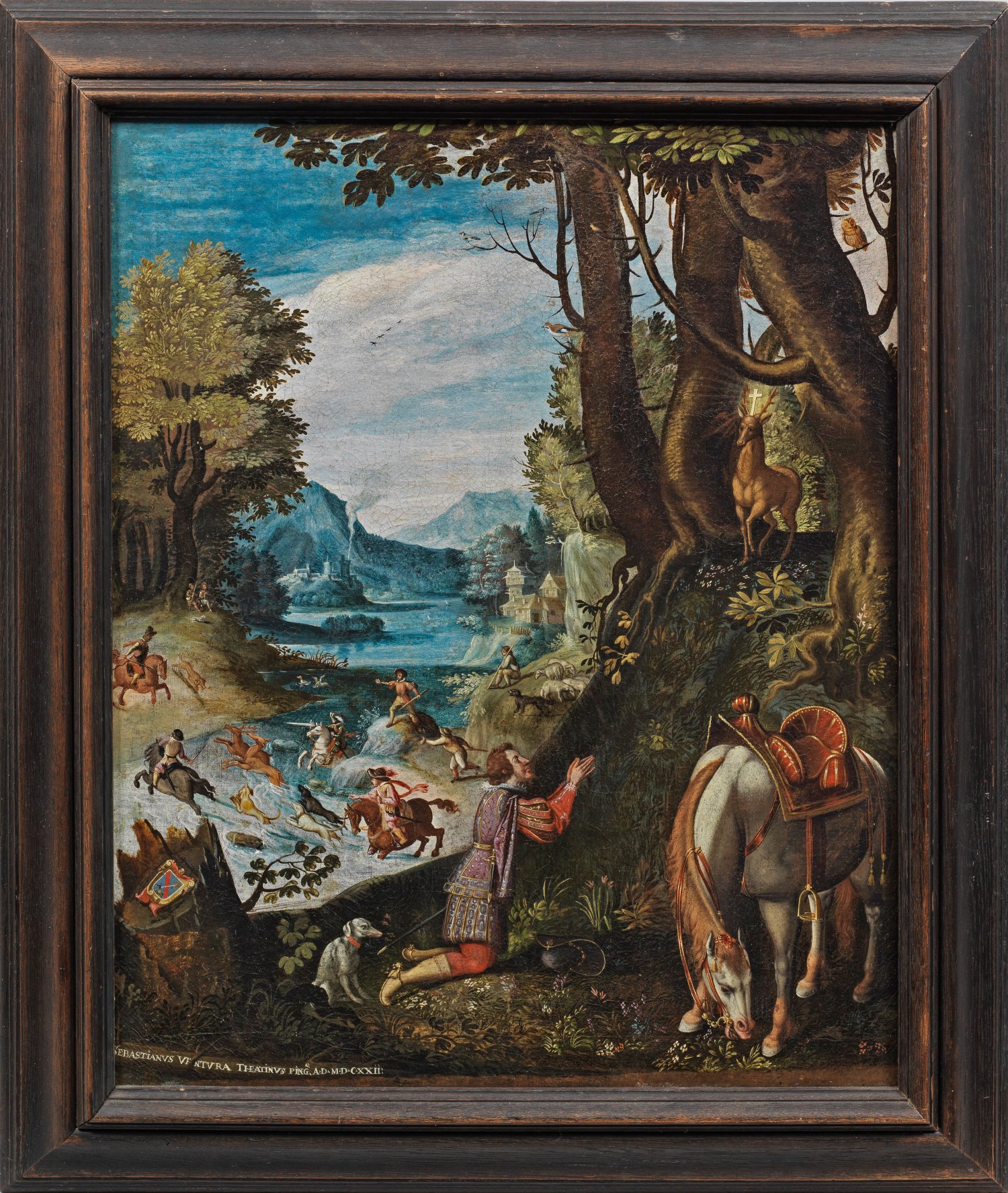 Das vorliegende Gemälde mit der Bekehrung des Hl. Hubertus ist eines der wenigen bekannten Werke von Sebastiano Ventura, der erst durch Forschungen in den letzten Jahren wiederentdeckt wurde. Als einziger Maler des 16. und 17. Jh. signierte er auch mit dem nachgesetzten "Theatinus", das sich auf Chieti (lat. Theatinus) als seinen Wirkungsort bezieht. Wie das vorliegende Gemälde anschaulich zeigt, war Ventura ein versierter Maler, sowohl in der Darstellung der Landschaft als auch der Figuren und Tiere sowie der dramatischen Jagdszene. Das Gemälde verbindet die berühmten Legenden mit der Hirschvision der Schutzpatrone der Jäger und Hunde - dem Hl. Eustachius und dem Hl. Hubertus -, die sich seit dem Mittelalter in ganz Europa verbreiteten. Ventura schildert diese populäre Geschichte, komponiert in eine bergige, bewaldete Flusslandschaft, erzählerisch und künstlerisch höchst virtuos, indem er sie anschaulich in drei Bildteile gliedert und durch das Kolorit und die Lichtführung tiefenräumlich staffelt. Dominant im Vordergrund kniet der still für sich betende Hl. Hubertus auf einer Lichtung in prachtvoller, höfischer Barocktracht, über ihn auf einer Anhöhe inmitten mächtiger Bäume der majestätische Hirsch mit leuchtendem Kreuz zwischen den Geweihstangen; friedlich flankiert wird Hubertus von seinem grasenden Schimmel und seinem hinter ihm sitzenden Hund. Im lärmenden Gegensatz hierzu steht im Mittelgrund eine wilde Hetzjagd auf ein von Hunden und berittenen Jägern eingekreistem Hirschpaar, das durch einen rauschenden Fluss zu flüchten versucht. Ein rechts davon ruhender Schafhirte leitet in die idyllische, friedliche Landschaft des Hintergrundes über, die von blauen Bergen und fantasievoller Architektur durchzogen ist. Öl/Lwd; L. u. sign. u. römisch dat. 1622 "SEBASTIANVS VENTVRA THEATINVS PINGat. A.D.M.D.C.X.X.II:". Überdies l. u. auf dem Baumstumpf ein Wappenschild mit Rollwerkkartusche. 75 cm x 61,5 cm. Rahmen.