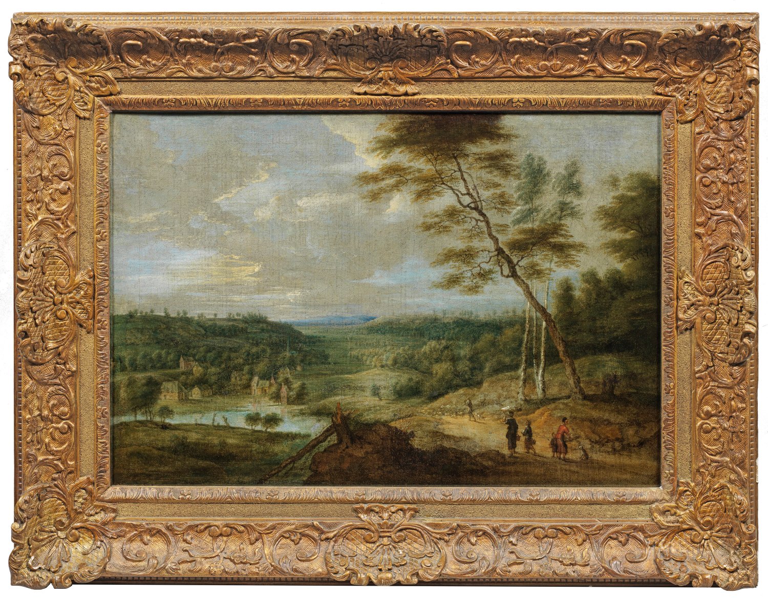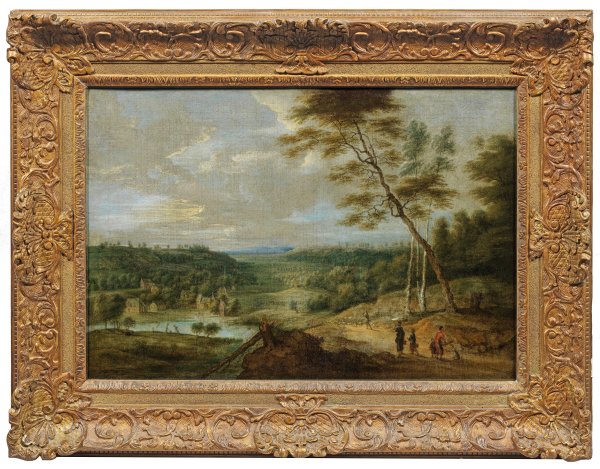 Komposition, Motiv und Stil der atmosphärisch gestimmten, sommerlichen Landschaft weisen auf ein Werk des Lucas van Uden hin. Aus einer Malerfamilie stammend wurde er 1626/27 in die Lukasgilde ausgenommen. Des öfteren arbeitete Lucas van Uden mit David Teniers d. J. zusammen, welcher die Figurenstaffage für seine Landschaften aus Brabant und Flandern schuf. Werke des flämischen Malers befinden sich in zahlreichen bedeutenden internationalen Museen, u.a. in Dresden, Petersburg, Brüssel, Frankfurt a. M., München, Antwerpen, Berlin und Wien. Öl/Lwd., doubl.; 49 cm x 73,5 cm. Rahmen.