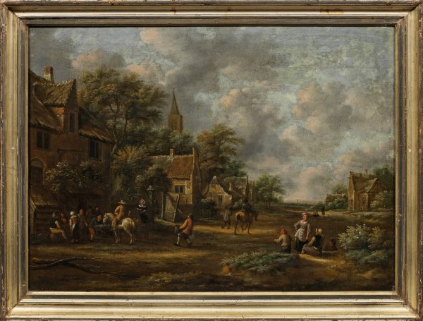 Dorfansicht mit rastenden Reitern und Bauern vor einer Herberge