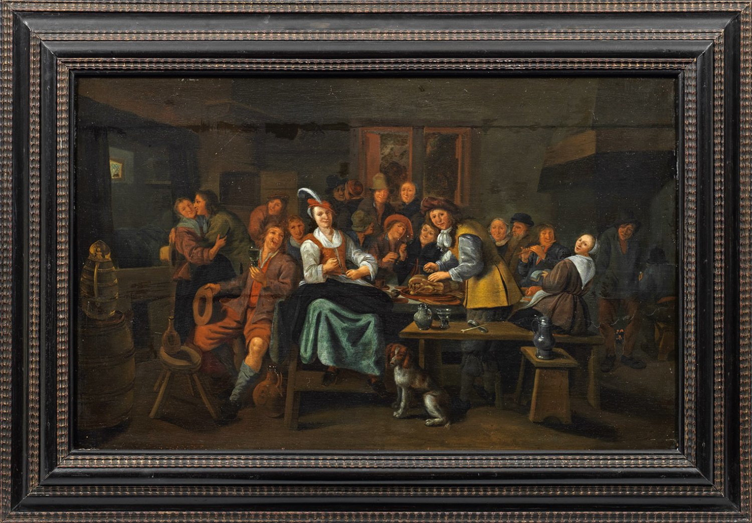Vielfigurige Szene in einer Schenke mit unterschiedlichen, vorwiegend bäuerlichen Figuren. Zentrale Hauptfiguren der Komposition sind ein wohl zueinander gehörendes, junges, festlich gewandetes Paar: ein an einem Tisch stehender Mann beim Aufschneiden eines Bratens und eine ihm gegenüber sitzende Frau mit rotem Wams und federgeschmücktem, rotem Barett, zu ihren Füßen ein sitzender Hund. Neben und hinter ihnen sind zuprostende, zechende und Flöte spielende Männer, Frauen und einander liebkosende Pärchen geschildert. In Motiv, Komposition, Figuren und Stil typisches Tafelbild des bekannten, größtenteils in Haarlem und Amsterdam tätigen Genremalers, der mit Vorliebe fröhliche Gesellschaften schilderte. Nachdem er anfänglich vor allem bürgerliche Szenen malte, schuf er später überwiegend bäuerliche Wirtshaus- und Interieurszenen, zu denen auch das vorliegende Gemälde zählt. Häufige Motive im Vordergrund bilden, so auch hier, Hunde und helle bzw. leuchtend gewandete, weibliche Figuren, welche durch die Lichtführung akzentuiert werden. Vergleichbare, vom RKD dokumentierte Werke befinden sich u. a. im Rijksmuseum in Amsterdam und Mauritshuis in Den Haag. Öl/Eichenholztafel. 49 cm x 79 cm. Rahmen.