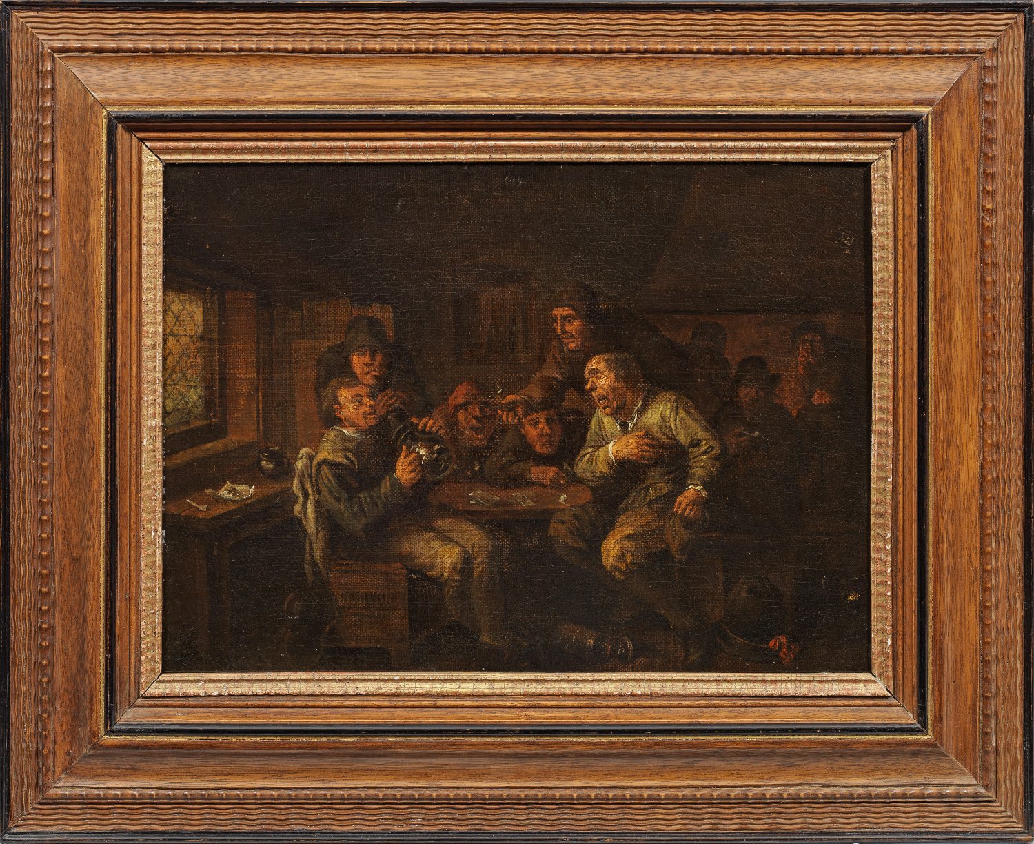 Tonig gemaltes Genrebild, das in Motiv und Stil evidente Parallelen zum Oeuvre sowohl von Egbert van Heemskerk dem Älteren als auch seinem gleichnamigen Sohn (1676 - 1744) aufweist, der wesentlich durch seinen Vater geprägt wurde. In der Tradition Adriaen van Ostades und Adriaen Brouwers malten sie mit Vorliebe humorvoll-erzählerische Darstellungen aus dem alltäglichen Leben und Wirtshausszenen mit teilw. drastisch karikierten, ungehobelten Bauern und Städtern. Egbert van Heemskerck der Ältere war ein Schüler Pieter de Grebbers und wurde wesentlich durch Jan Miese Molenaer und Jan Steen beeinflusst. Öl/Lwd., doubl.; 28,5 cm x 40 cm. Rahmen.