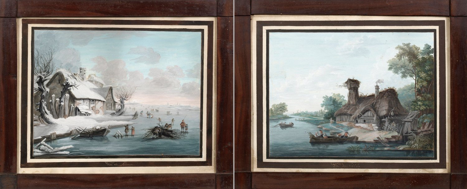 Gegenstücke. Holländische Winterlandschaft mit reicher Figurenstaffage; die andere, sommerliche Flusslandschaft mit pittoreskem Gebäude und Windmühlen nach einer 1769 erschienenen Radierung von C. Guttenberg (nach einem Gemälde von Franz Edmund Weirotter). Gouache/Papier. R. u. sign.; unterhalb betitelt. Gouache/Papier. Jeweils r. u. sign.; m. u. betitelt. 25 cm x 31,5 cm. Wohl Original-Rahmen.