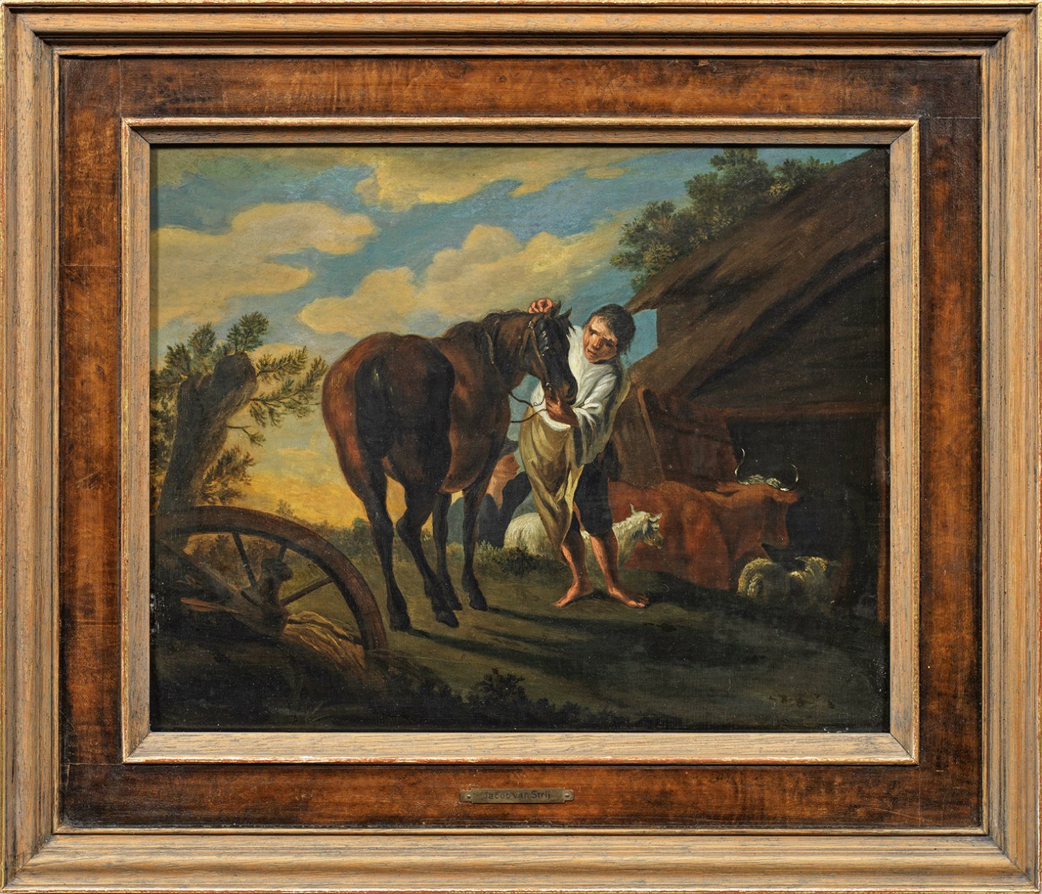Fein lasierend gemaltes, ländliches Genrebild mit Hirten- bzw. Bauernmotiv, das durch die für Jacob van Strij charakteristische, lebendige Wiedergabe der Tiere herausragt. Öl/Eichenholztafel. L. u. undeutl. sign.; 31 cm x 39,5 cm. Rahmen.