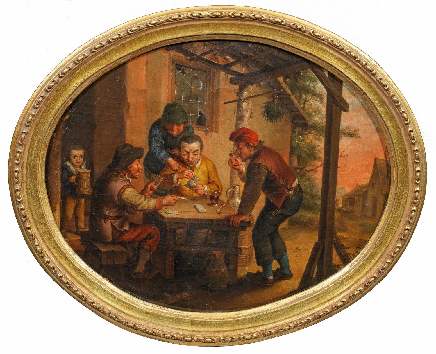 Abendlich gestimmte Szene mit zwei Kartenspielern, an grob gezimmertem Mobiliar sitzend, hinter ihnen bzw. an der Seite stehend zwei bäuerliche Figuren als Zuschauer und Berater, am linken Bildrand ein Knabe beim Heraustragen einer großen Schenkkanne, auf der rechten Bildseite im Hintergrund die Dorfstraße. In der Tradition der Kartenspieler-Szenen von David Teniers d. J. und anderen Künstlern des Barock gemaltes Genrebild. Konrad Huber schuf vornehmlich Altarbilder und Fresken mit religiösen Motiven für Kirchen und andere öffentliche Gebäude im süddeutschen Raum, besonders in Schwaben, aber auch in Würzburg. Er studierte 1770-1773 an der Stuttgarter Kunstakademie und ließ sich danach in Weißenhorn nieder. Öl/Lwd.; Verso alter Klebezettel mit Zuschreibung an Conrad (Konrad) Huber (1752 - 1830). 40 cm x 49,5 cm, im Oval. Rahmen.