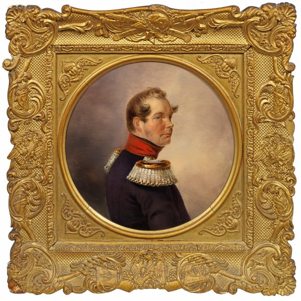 Tondo mit Porträt Friedrich Wilhelm (IV.), ab 1840 preußischer König, in Uniform, von der Seite nach rechts, den Kopf im Dreiviertelprofil zum Betrachter gewendet. Zu vergleichen ist das Bildnis mit einem Porträtgemälde von Joseph Karl Stieler (1781 - 1858) und einem Punktierstich von Auguste Hüssener (1789 - 1877), für den Franz Krüger die zeichnerische Vorlage lieferte und der im "Berliner Taschenkalender für das Jahr 1835" erschien. Öl/Karton. D. 21 cm. Mit Messing beschlagener, reich reliefierter Original-Rahmen.