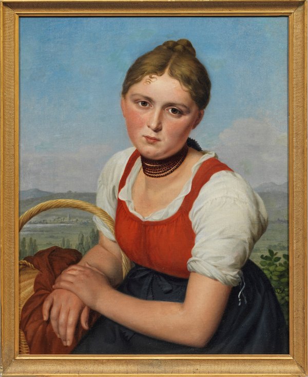 Subtil charakterisiertes, feinmalerisches Bildnis einer jungen Frau mit Weidenkorb, posierend vor einer bergigen Seenlandschaft mit italienischer Dorfansicht. Die virtuose Behandlung der Stofflichkeit, das naturnahe, leuchtende Kolorit und lebendige Inkarnat, aber auch die Komposition mit zentraler, betonter Positionierung der Porträtierten und der in der Ferne verblassenden, landschaftlichen Kulisse ist nicht nur zeittypisch sondern auch charakteristisch für die Bildnisse Schadows. Die Komposition erinnert stark an das "Bildnis einer römischen Frau in braunem Samtkleid, einen Rosenkranz haltend" (1831/32; Grewe 146) in der Alten Nationalgalerie in Berlin, während das Sujet des italienischen, in bäuerlicher Tracht gekleideten Mädchens thematisch an vier Bildnisse (Grewe 141 - 144) aus den Jahren 1830/31 anknüpft, deren Verbleib unbekannt ist. Schadow, Sohn des bedeutenden, klassizistischen Bildhauers Johann Gottfried Schadows, erhielt seinen ersten künstlerischen Unterricht bei seinem Vater und studierte anschließend an der Berliner Akademie als Schüler von Friedrich Georg Weitsch und Karl Wilhelm Wach. 1810 ging er zusammen mit seinem Bruder, dem Bildhauer Rudolf Schadow, nach Italien, wo er Bertel Thorvaldsen kennenlernte und Kontakte zu dem Künstlerkreis um Caroline von Humboldt schloss. Fasziniert von den Nazarenern trat er 1813 dem Lukasbund bei. 1819 kehrte er nach Berlin zurück, wo er bis 1826 an der Akademie lehrte. Anschließend ging er als Nachfolger von Peter von Cornelius als Direktor der Akademie nach Düsseldorf, wo er die Begründung der Düsseldorfer Malerschule maßgeblich mitgestaltete und prägte. Öl/Lwd.; R. u. monogr.; Rest., Retuschen. 69,4 cm x 56,3 cm. Rahmen.