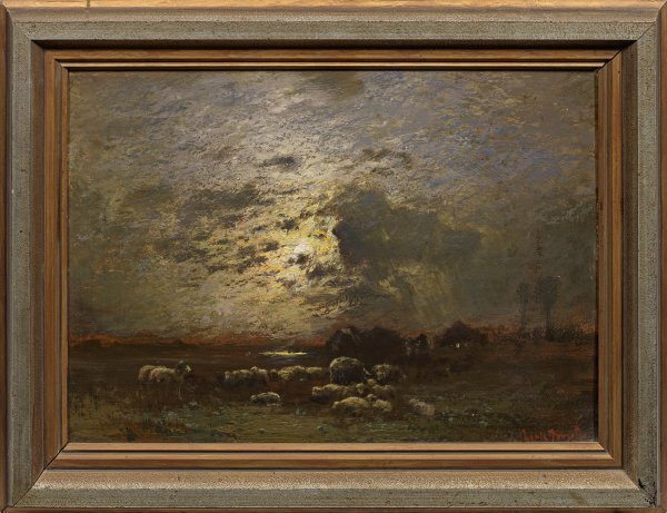 Impressionistisch aufgefasste, atmosphärische Mondscheinlandschaft mit effektvoller Schilderung des Lichts. Ein in Stil und Motiv typisches Werk Douzettes, der 1855/56 nach Berlin ging, wo er Schüler des Marine- und Landschaftsmalers Hermann Eschke wurde. Ab 1860 reiste er regelmäßig an die Ostseeküste, nach Rügen und auf den Darß. Schon in den 1860er Jahren entstanden erste Mondscheinlandschaften, die eines seiner Hauptsujets wurden. Douzette, der ab 1895 in Barth lebte, war zugleich mit der nahegelegenen Künstlerkolonie in Ahrenshoop verbunden. Öl/Malkarton. R. u. sign.; 34,5 cm x 50 cm. Rahmen.