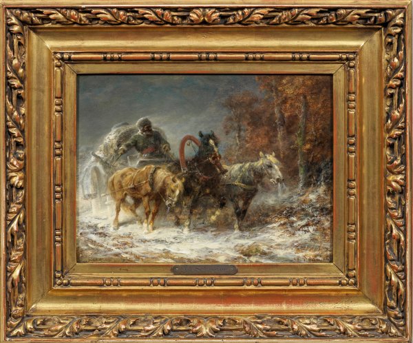 Seltenes, russisches Motiv Schreyers, der zu den Bahnbrechern des Realismus und Impressionismus gehörte. Nach weiten Reisen war er 1861-1870 dauerhaft und ab 1871 winters in Paris ansässig, wo er seinen künstlerischen Durchbruch feierte und international berühmt wurde. Bekannt machten Schreyer insbesondere seine lebendigen Schilderungen des Orients, nachdem er auf Reisen durch Nordafrika und den Nahen Osten, die ihn faszinierende Kultur der Araber kennengelernt hatte. Öl/Mahagonitafel. R. u. sign.; 23,5 x 32 cm. Wohl Original-Rahmen.