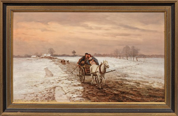 In sehr fein lasierender Malerei ausgeführtes, atmosphärisch gestimmtes Werk. Das Oeuvre des polnischen Malers umfasst insbesondere Reiter- und Pferdemotive, Gespanne und Schlitten sowie Szenen aus den Napoleonischen Kriegen. Wolski studierte an der Akademie in Warschau bei Wojciech Gerson und in Krakau bei Jan Matejko. Bei einem weiteren Studium in München dürfte er auch die Werke der dort tätigen polnischen Maler Józef Brandt und Alfred von Wierusz-Kowalski kennengelernt haben. Werke Wolskis befinden sich u. a. im Nationalmuseum in Warschau. Öl/Holztafel. R. u. sign. "P. Wolsky". Verso altes Etikett mit deutscher Betitelung "Postbote in Polen". 31 cm x 52,5 cm. Rahmen.