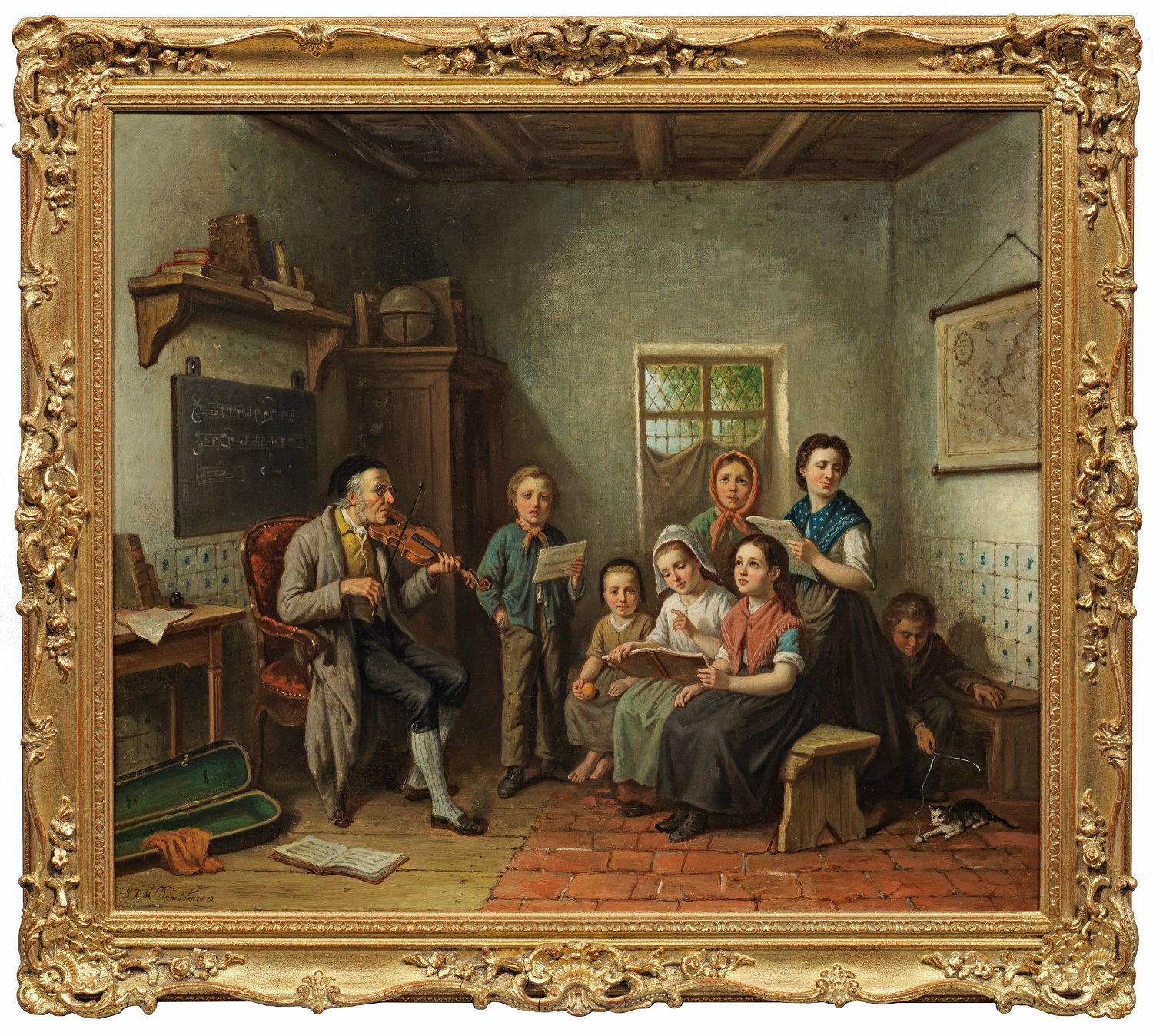 Szenische Darstellung in einem niederländischen Interieur mit streng blickendem, älterem Lehrer beim Violinspiel, in der Bildmitte ein singender Knabe mit Notenblatt, auf der rechten Seite auf einer Bank sitzend und stehend vier Mädchen, die ebenfalls andächtig singen. Im Kontrast hierzu hat sich am rechten Bildrand ein Knabe im Schatten hinter den Rücken der Mädchen ein gelangweilter Knabe versteckt, der mit einer jungen Katze spielt, hierbei kritisch beäugt von einer stehenden jungen Frau. Stimmungsvolles, motiv- und stiltypisches, erzählerisches Werk des bekannten holländischen Genremalers, die sich durch eine subtile, feinfühlige Schilderung der einzelnen Figuren auszeichnet. Der auf Interieurszenen spezialisierte Damschröder war in mehreren Städten Hollands ansässig und zeigte seine Gemälde ab 1850 mit großem Erfolg auf vielen Ausstellungen. Öl/Lwd.; L. u. sign.; 66 cm x 78 cm. Rahmen.