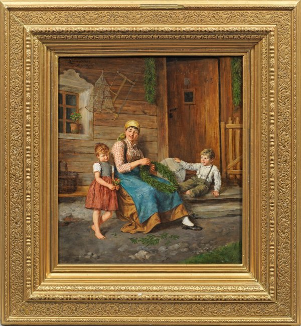 Erzählerische, realistisch geschilderte Genreszene aus dem ländlichen, bayerischen Volksleben in lebendiger, kräftiger Farbgebung. Obersteiner studierte ab 1881 bei Otto Seitz an der Akademie in München, wo er ansässig wurde. Öl/Lwd.; L. o. sign. mit Ortsangabe München. Flickendoubliert. 54,5 cm x 48,5 cm. Rahmen.