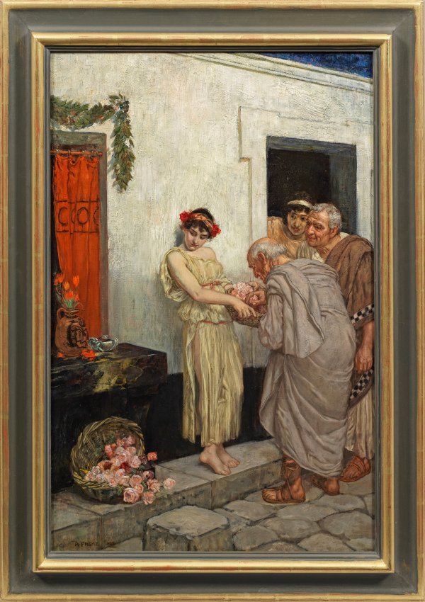 Narrative und subtil beobachtete Szene des Düsseldorfer Künstlers, der eine Vorliebe für die Antike besaß. Frenz kam 1879 an die Düsseldorfer Kunstakademie und wurde Meisterschüler von Peter Janssen. Während eines einjährigen Aufenthaltes in München wurde er Privatschüler Franz v. Lenbachs. Nach seinen wichtigsten Schaffensjahren in Düsseldorf führte ihn sein Künstlerleben u. a. nach Italien, wo ihn die Schönheit südlicher Natur faszinierte. Arnold Böcklin und Franz Stuck bestärkten ihn darin, mythologische und symbolistische Phantasiebilder in einem kontrastreichen Stil zu schaffen, die von der Kunstkritik gerühmt wurden. Öl/Lwd., teils doubliert; L. u. sign. und dat. 1903. Rest.; 72 cm x 47,5 cm. Rahmen.
