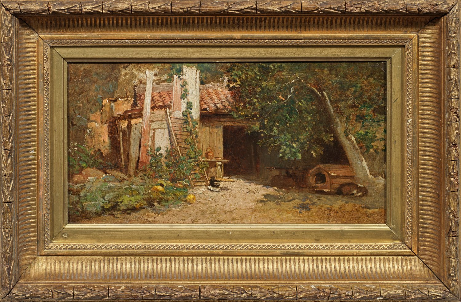 Realistische, seltene Landschaftsimpression des Malers. Als Schüler von Jean-Pierre Alaux debütierte er 1849 auf dem Salon in Paris, den er danach häufig beschickte. Öl/Holztafel. R. u. sign.; 19,5 cm x 39,5 cm. Rahmen.