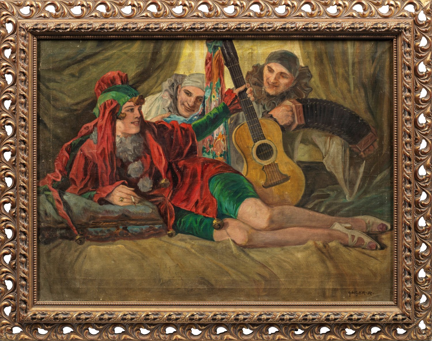 Am Rande eines fröhlichen Maskenballs ruhende Colombine, mit den verkleideten Herren flirtend und in der rechten Hand eine Zigarette haltend. In Motiv und Stil charakteristisches Werk Geigers mit subtil erotischer Szene. Geiger studierte an der Wiener Akademie und in Paris an der Académie Julian. 1893 ließ er sich in Budapest nieder. Neben weiblichen Akten und Bildnissen wurde er besonders durch seine fröhlichen Darstellungen aus der Faschingszeit bekannt, in deren Zentrum Pierretten und Colombine stehen. Öl/Lwd., R. u. sign.; 74 cm x 100 cm. Rahmen.