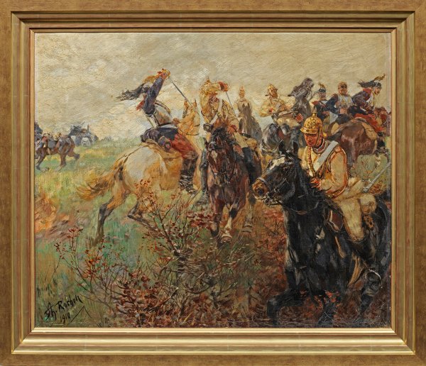 Wohl Soldaten des preußischen Garde-Kürassier-Regiments darstellendes Gemälde Rocholls, dem mit einem nuancierten, teilw. lockerem, schnellen, weich-pastosen Duktus eine virtuose, höchst lebendige Schilderung der Schlacht gelingt. Rocholl studierte 1871-1883 an den Kunstakademien in Dresden, München und Düsseldorf bei Julius Schnorr von Carolsfeld, Ludwig Richter, Carl Theodor von Piloty, Eduard Gebhardt und Wilhelm Sohn. In Düsseldorf fand er zur Militär- Schlachtenmalerei und wurde auf diesem Gebiet rasch einer der bekanntesten und bedeutendsten Künstler. Öl/Lwd., doubl.; L. u. sign. u. dat. 1910. 55,5 cm x 67,5 cm. Rahmen.