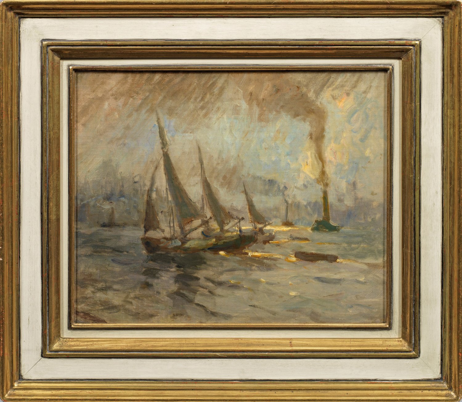 Auslaufende Segler und Dampfschlepper im Morgendunst