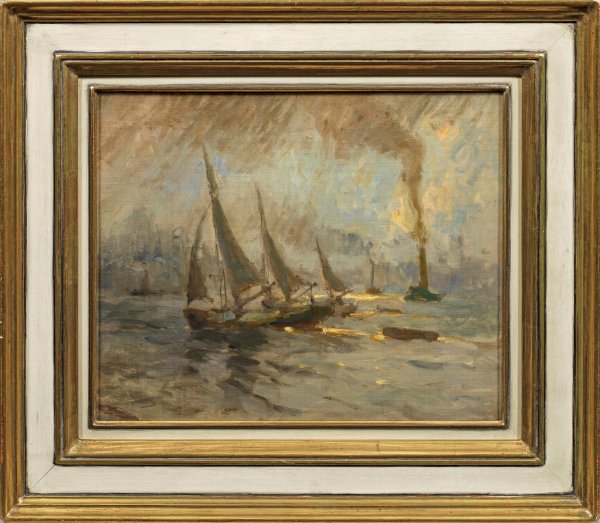 Impressionistisches, motiv- und stiltypisches Hafenmotiv Sandrocks, der sich seit 1898 alljährlich an den Großen Berliner Kunstausstellungen beteiligte. Der namhafte Kunstkritiker Max Osborn rühmte Sandrock 1912 als "eins der stärksten und hoffnungsvollsten Talente der Berliner Malerzunft" und dessen furiosen Stil. Besonders fasziniert war Sandrock von der maritimen Welt. Öl/Lwd., doubl; Verso Etikett der Sandrock-Ausstellung in der Hamburgischen Landesbank 1992, Nr. 076. 34 cm x 42,4 cm. Rahmen.