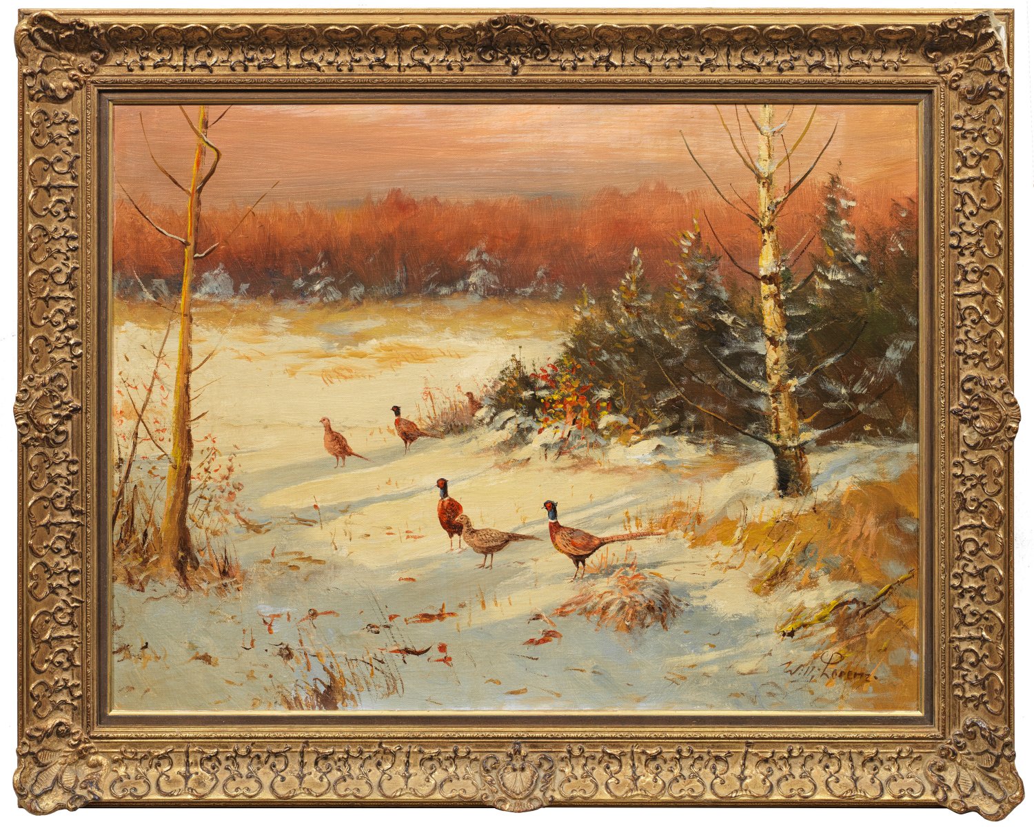 In warmes Licht getauchte, verschneite Landschaft mit Fasanen. Charakteristisches, impressionistisches Werk des bekannten Tier- und Jagdmalers, der die Tiere sowohl in freier Wildbahn als auch in Zoos studierte und in großer Lebendigkeit darstellte. Öl/Lwd.; R. u. sign.; Verso auf Echtheitszertifikat betitelt und vom Künstler nochmals sign.; 60 cm x 80 cm. Rahmen.