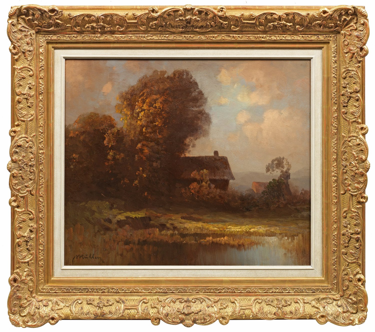 Warmtonig gemalte, abendliche Stimmungslandschaft Mulleys, der vor allem durch seine Alpenmotive bekannt ist. Der Künstler studierte 1910-1913 an der Wiener Akademie bei Alois Delug und Rudolf Jettmar. Während seiner Kufsteiner Schaffensperiode 1918-1934 entwickelte er einen eigenen, in Garmisch fortgeführten Malstil für seine oft in wirkungsvoller Spachteltechnik ausgeführten Alpenlandschaften. In spannungsreich komponierten Gemälden schilderte er die Erhabenheit der Hochgebirgswelt mit alten Berghöfen und Kapellen vor schroff aufragenden Bergmassiven und Talabgründen. Öl/Malkarton. L. u. sign.; 50 cm x 60,5 cm. Rahmen.