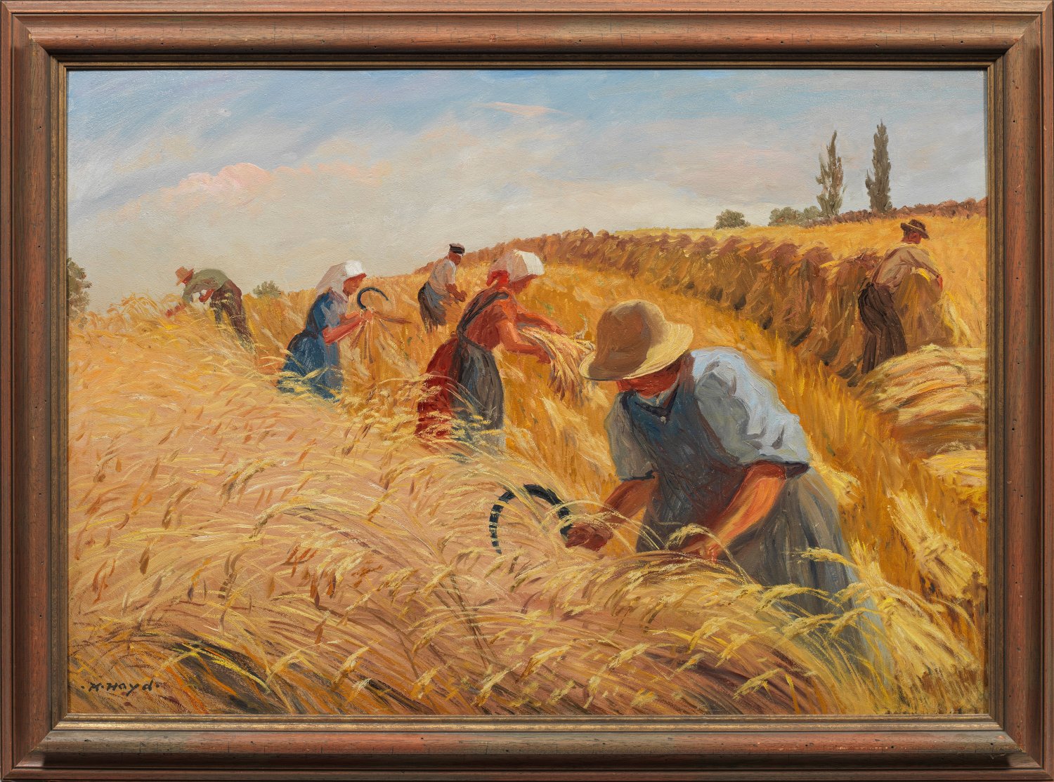 Sommerliche atmosphärische Schilderung einer Getreideernte, die in ihrer kräftigen und ausdrucksstarken Farbigkeit charakteristisch für Hayd ist. 1902 - 1906 absolvierte er ein Studium an der Akademie in Wien, anschließend in Prag. Nach seiner Rückkehr lernte er Egon Schiele kennen, mit dem ihn fortan eine Freundschaft verband. Sein Oeuvre ist sowohl technisch als auch motivisch äußerst vielschichtig. Hayd, der malerisch stets gegenständlich blieb, schuf Blumenstillleben, Landschaften, Stadtansichten und Genrebilder, illustrierte zudem Bücher, gestaltete Plakate und beschäftigte sich mit Industriedarstellungen. Im Ersten Weltkrieg arbeitetet er als Kriegsmaler, wobei er jedoch die oftmals praktizierten heroischen Überhöhungen vermied und vor allem das Makabre, Mörderische und Gespenstische des Kriegsgeschehens abbildete. Öl/Malkarton. L. u. sign. Verso auf einem Atelieretikett betitelt. 69,5 cm x 99 cm. Rahmen.